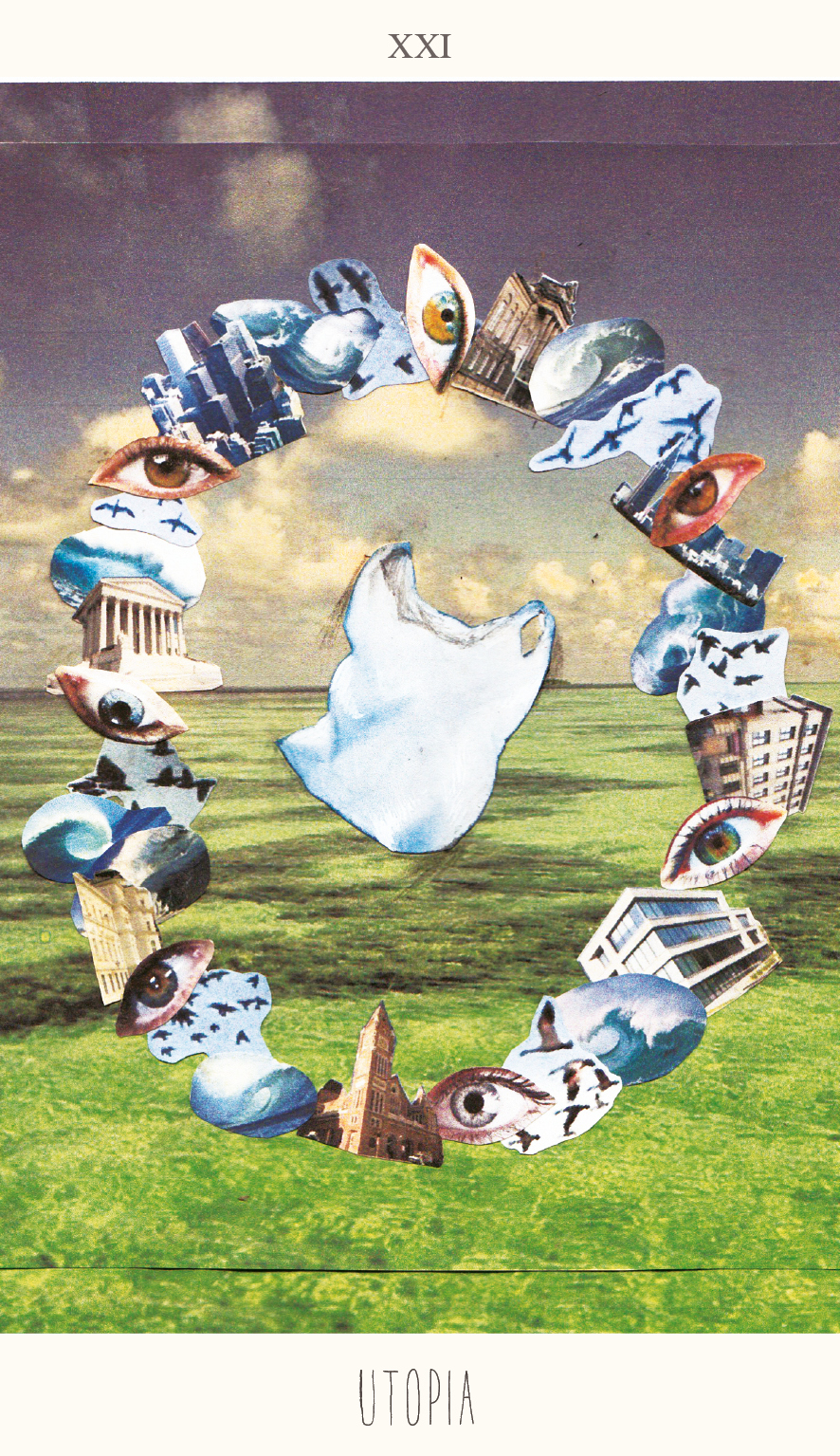 In Utopia the journey of Hope comes to its completion. Inside the circle of Eyes, Swarms, Houses and Waves, the bag is dancing out its coming into full realization of itself, the World, and all that is in it. In Utopia all four elements have reached complete harmony. The Waves, which stand for the unconscious and the emotions that guide our lives, have reached a perfect balance with the rational wisdom of the Eyes. The Houses’ pragmatic take on the ordering of the world through economy and work has entered into a fruitful dialogue with the ever-changing commonal demands of the Swarms. Hope has found its place in the community, the economy, the intellect and the emotions. Utopia is the mirror of the zero-card Hope, where the conflictuous disarray of the elements threatened to destroy the city and disperse the community, under an avalanche of subconscious retribution, leaving the rational mind’s Eye impotent and confused. Now all elements have rearranged in a continuous oval circle dance, reminiscent of the female sex in all its potential of creation and renewal. All is in movement, and all is ecstasy because all differences have succumbed. The subconscious and the conscious have dissolved into a state of completed consciousness. The male and the female have become one and many.